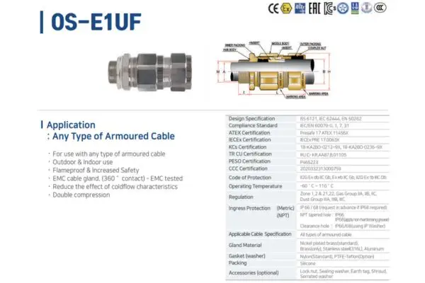 OSCG Cable Gland รุ่น Armoured OS-E1UF เป็นอุปกรณ์ที่ออกแบบมาโดยเฉพาะสำหรับใช้งานกับ สายไฟหุ้มเกราะ (Armoured Cable) ในพื้นที่ที่มีความเสี่ยงสูง เช่น พื้นที่ที่อาจเกิดการระเบิด หรือในสภาพแวดล้อมอุตสาหกรรมที่มีฝุ่นหรือสารเคมีที่ติดไฟได้ โดยมีคุณสมบัติเด่นที่เน้นการป้องกันและความปลอดภัย ถูกออกแบบให้ยึดเกราะโลหะ (Steel Wire Armour – SWA) ได้แน่นหนา พร้อมยังรักษาการต่อเชื่อมไฟฟ้าอย่างมีประสิทธิภาพ