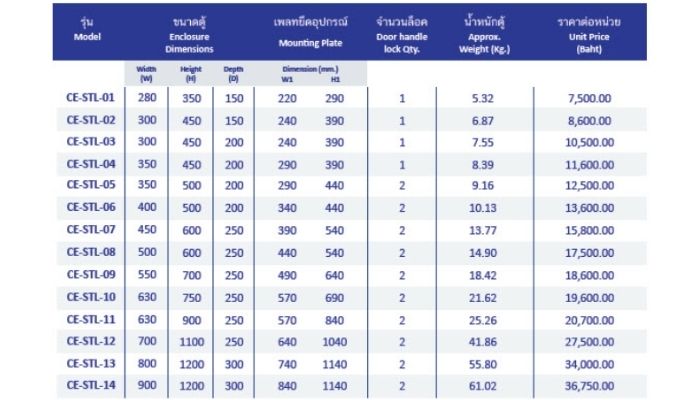 | 1. ประเภทของตู้ | – ตู้แขวนผนัง (Wall-Mounted): ติดตั้งบนผนัง ประหยัดพื้นที่ เหมาะกับอุปกรณ์ขนาดเล็กหรือในพื้นที่จำกัด – ตู้ตั้งพื้น (Floor-Standing): รองรับอุปกรณ์ขนาดใหญ่ เหมาะสำหรับโรงงานหรือสถานีไฟฟ้า – ตู้มีหลังคา (With Roof): เหมาะสำหรับการติดตั้งกลางแจ้ง ป้องกันน้ำฝนและแสงแดดได้ดี |